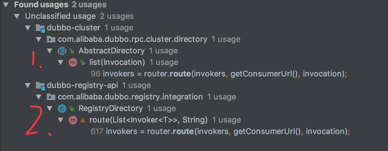如下图所示,我们可以看到,有**二个类**,调用 Router#route(List<Invoker>, URL, Invocation) 方法,集成 Router 模块。