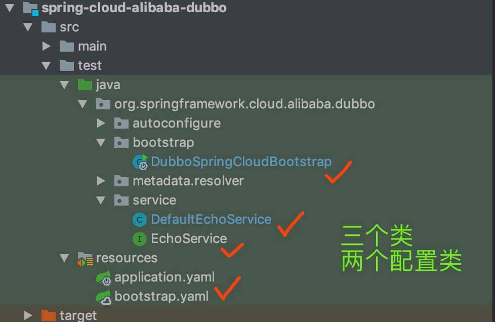 ```plain text plain // DubboSpringCloudBootstrap.java @EnableDiscoveryClient // 开启注册发现 @EnableAutoConfiguration // 开启自动配置 @EnableFeignClients // 开启 Feign Client @RestController public class DubboSpringCloudBootstrap { @Reference(version = “1.0.0”) private EchoService echoService; @Autowired @Lazy private FeignEchoService feignEchoService; @Autowired @Lazy private DubboFeignEchoService dubboFeignEchoService; public static void main(String[] args) { new SpringApplicationBuilder(DubboSpringCloudBootstrap.class) .run(args); } }
