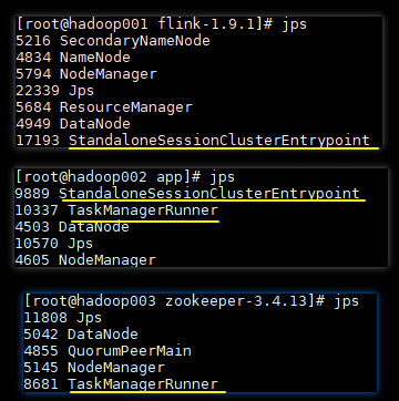 只有 hadoop001 和 hadoop002 的 JobManager 进程,hadoop002 和 hadoop003 上的 TaskManager 进程都已经完全启动,才表示 Standalone Cluster HA 模式搭建成功。