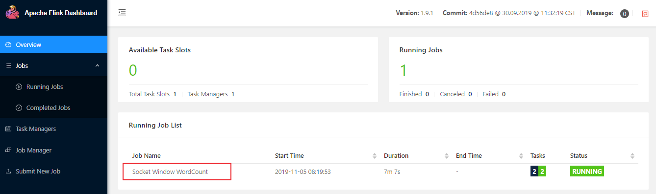 该 JAR 包的源码可以在 Flink 官方的 GitHub 仓库中找到,地址为 :SocketWindowWordCount ,可选传参有 hostname, port,对应的词频数据需要使用空格进行分割。