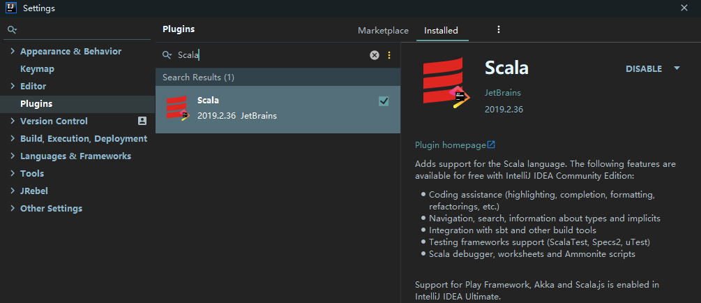 Flink 分别提供了基于 Java 语言和 Scala 语言的 API ,如果想要使用 Scala 语言来开发 Flink 程序,可以通过在 IDEA 中安装 Scala 插件来提供语法提示,代码高亮等功能。打开 IDEA , 依次点击 File => settings => plugins 打开插件安装页面,搜索 Scala 插件并进行安装,安装完成后,重启 IDEA 即可生效。