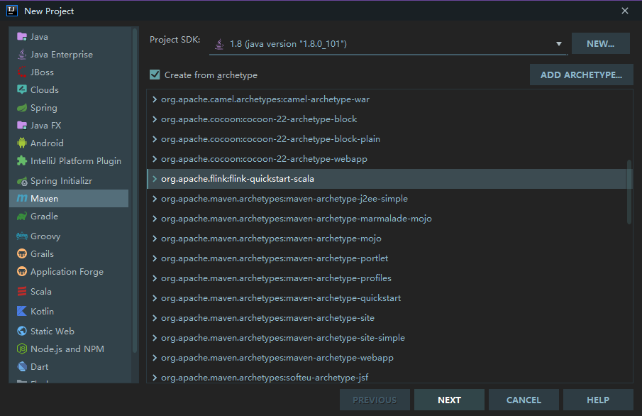 选中 Flink Archetype ,然后点击 NEXT 按钮,之后的所有步骤都和正常的 Maven 工程相同。