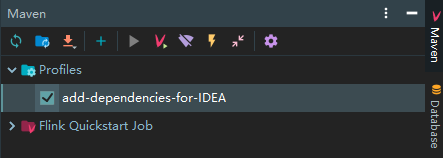 在 id 为 add-dependencies-for-IDEA 的 profile 中,所有的核心依赖都被标识为 compile,此时你可以无需改动任何代码,只需要在 IDEA 的 Maven 面板中勾选该 profile,即可直接在 IDEA 中运行 Flink 项目: