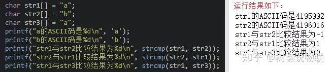 - strcmp()在比较的时候会把字符串先转换成ASCII码再进行比较,返回的结果为0表示s1和s2的ASCII码相等,返回结果为1表示s1比s2的ASCII码大,返回结果为-1表示s1比s2的ASCII码小,例如: