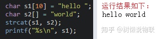 - strcat在使用时s1与s2指的内存空间不能重叠,且s1要有足够的空间来容纳要复制的字符串,如: