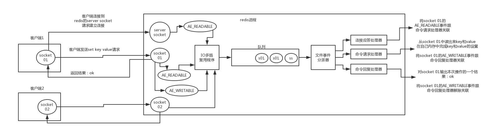 - 假设此时客户端发送了一个 set key value 请求,此时 Redis 中的 Socket01 会产生 AE_READABLE 事件,IO 多路复用程序将事件压入队列,此时事件分派器从队列中获取到该事件,由于前面 Socket01 的 AE_READABLE 事件已经与命令请求处理器关联,因此事件分派器将事件交给命令请求处理器来处理。命令请求处理器读取 Scket01 的 set key value 并在自己内存中完成 set key value 的设置。操作完成后,它会将 Scket01 的 AE_WRITABLE 事件与令回复处理器关联。