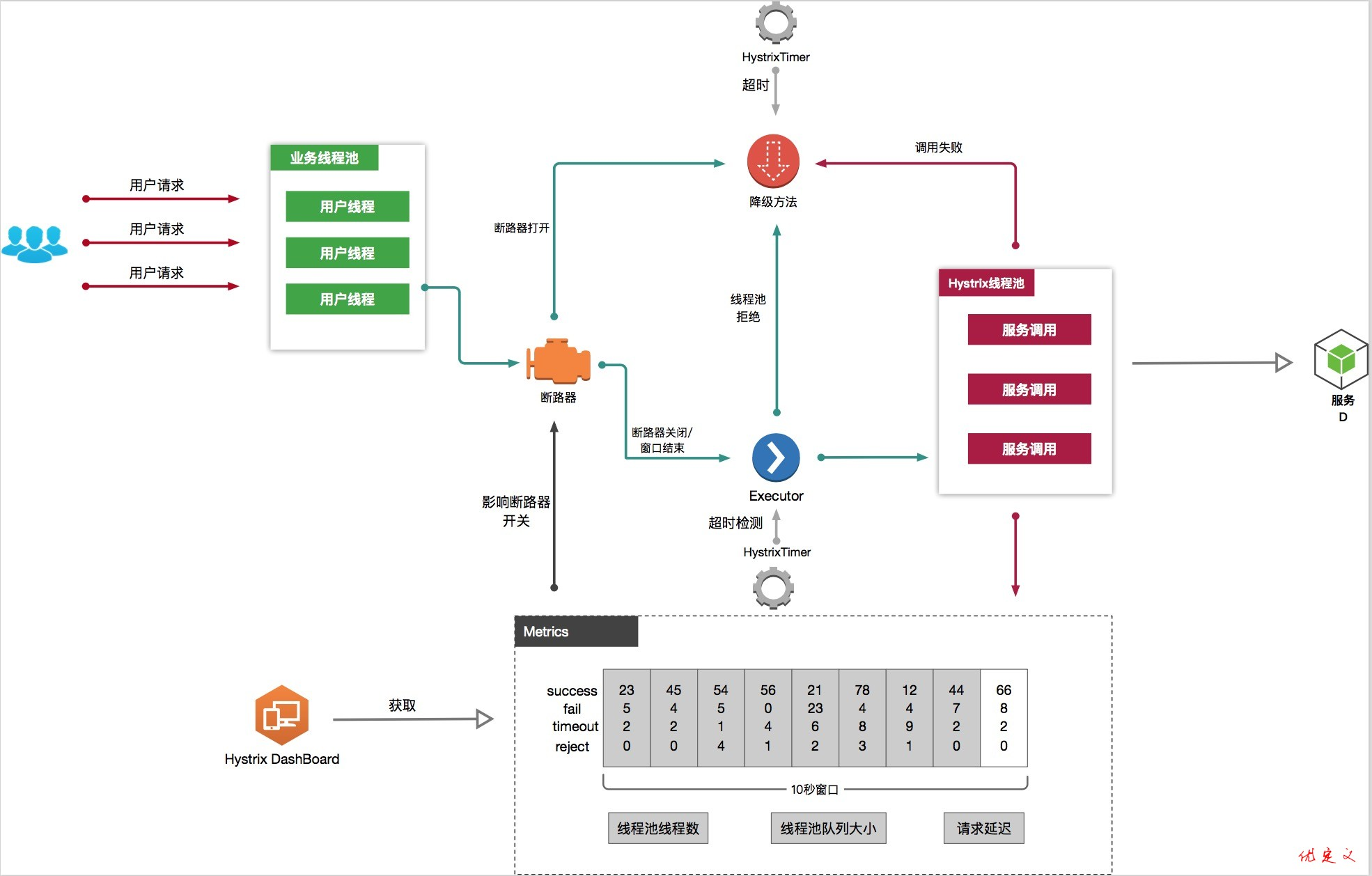 - 周期( 可配,HystrixCommandProperties.default_metricsRollingStatisticalWindow = 10000 ms )内,总请求数超过一定量( 可配,HystrixCommandProperties.circuitBreakerRequestVolumeThreshold = 20 ) 。
