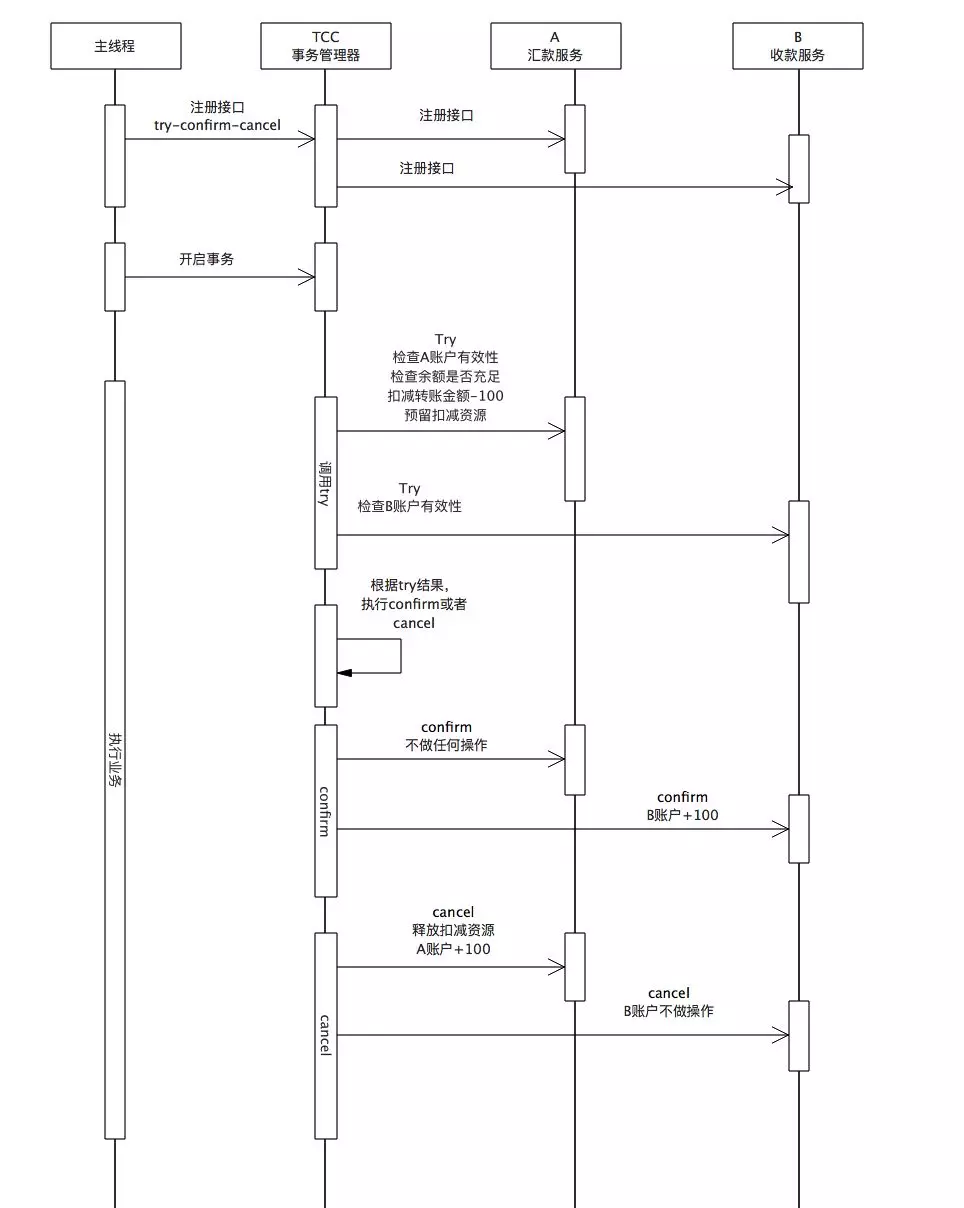 下面对TCC模式下,A账户往B账户汇款100元为例子,对业务的改造进行详细的分析: