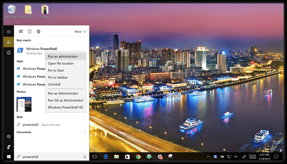 为此,请搜索PowerShell,右键单击,然后选择以管理员身份运行。