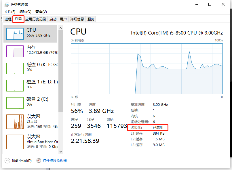 前提:Docker 在 window 上需要你的 Cpu 支持虚拟化,怎么查看是否支持或者打开?打开任务管理器,选择性能就可以查看,如图