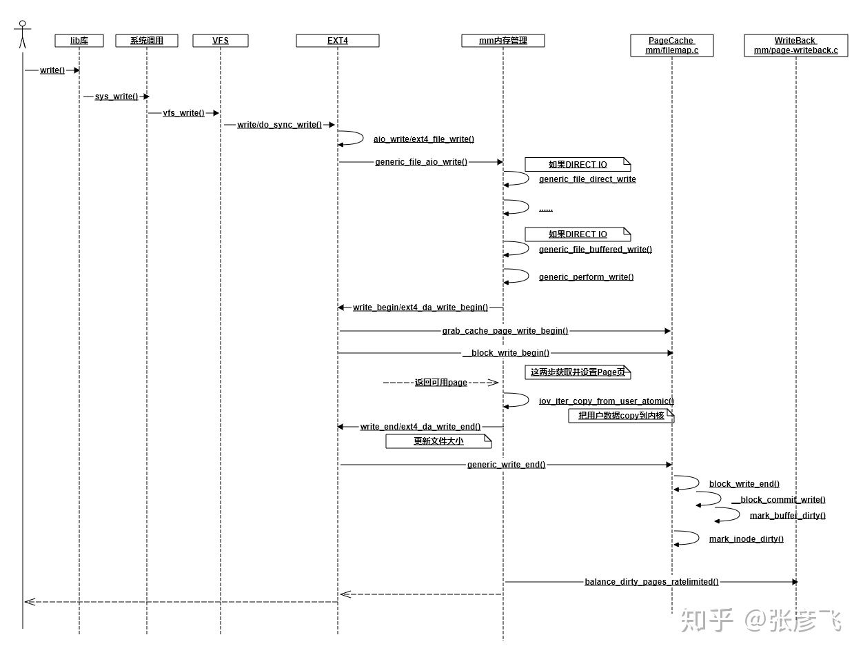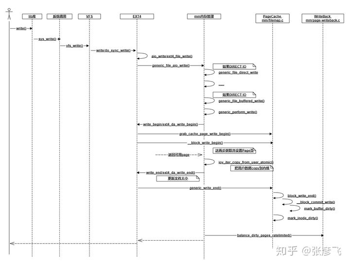 我花了不短的时候跟踪write写到ext4文件系统时的各种调用和返回,大致理出来了一个交互图。当然为了突出重点,我抛弃了不少细节,比如DIRECT IO、ext4日志记录啥的都没有体现出来,只抽取出来了一些我认为关键的调用。