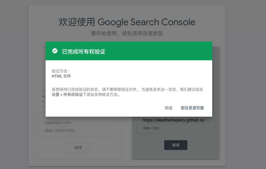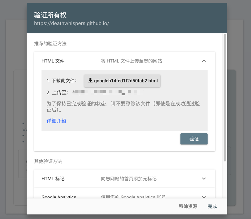 网站给我们提示了一个推荐验证方法:是通过在你的网站上添加一个它提供的HTML文件来验证,我们将这个 html 文件下载下来,并上传到 GitHub,通过浏览器能正常访问该文件就可以。点击“验证”提示已完成所有权验证