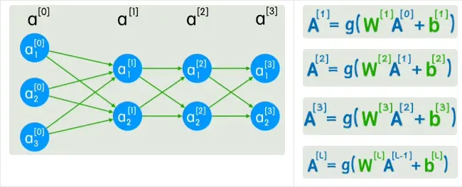 把层级用下标/上标表示($a^{[0]}$ 为输入,$a^{[1]}$、$a^{[2]}$ ……为中间层),就能用统一的通式描述任意深度网络的前向传播。这种矩阵表达的好处有两点: