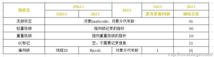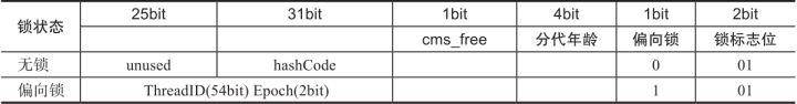 上面提到了轻量级锁的加锁解锁操作,是需要依赖多次 CAS 原子指令的。那么偏向锁是如何来减少不必要的 CAS 操作呢?我们可以查看 Mark Word 的数据结构就明白了。