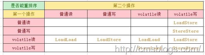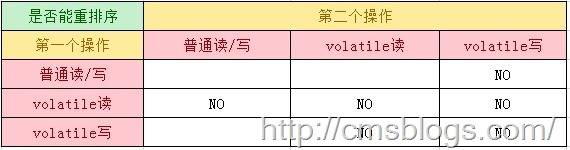 我们着重看第三点 Volatile规则:对 volatile变量的写操作,happen-before 后续的读操作。为了实现 volatile 内存语义,JMM会重排序,其规则如下:
