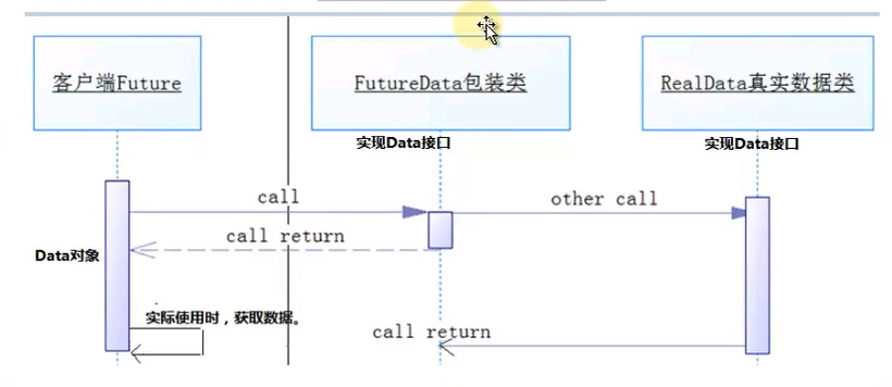 public class FutureClient { /** * 在发送请求时,先返回一个futureData给生产着, * 与此同时,启动一个新的线程执行业务逻辑,没有返回真实的结果 * 在线程中,执行需要处理的业务逻辑,完成后,将处理结果存放到RealData中 * * @param queryStr / * @return Data */ public Data request(final String queryStr) { FutureData futureData = new FutureData(); new Thread(() -> { final RealData realData = new RealData(queryStr); futureData.setRealData(realData); }).start(); return futureData; } }} }