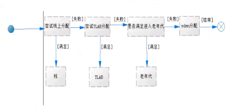 一般情况,首次创建的对象会被放置在新生代的eden区,如果没有GC介入,则对象不会离开eden区;