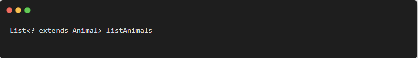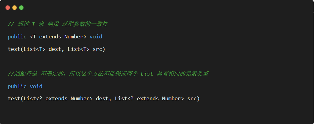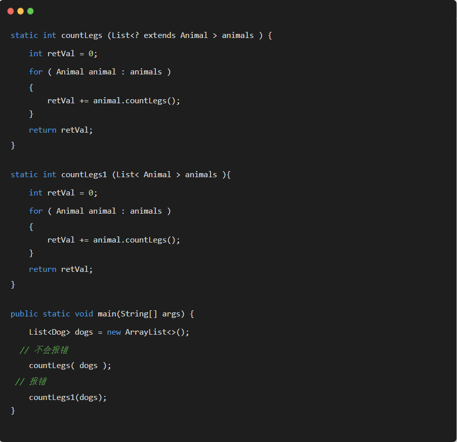 所以,对于不确定或者不关心实际要操作的类型,可以使用无限制通配符(尖括号里一个问号,即 <?> ),表示可以持有任何类型。像 countLegs 方法中,限定了上届,但是不关心具体类型是什么,所以对于传入的 Animal 的所有子类都可以支持,并且不会报错。而 countLegs1 就不行。
