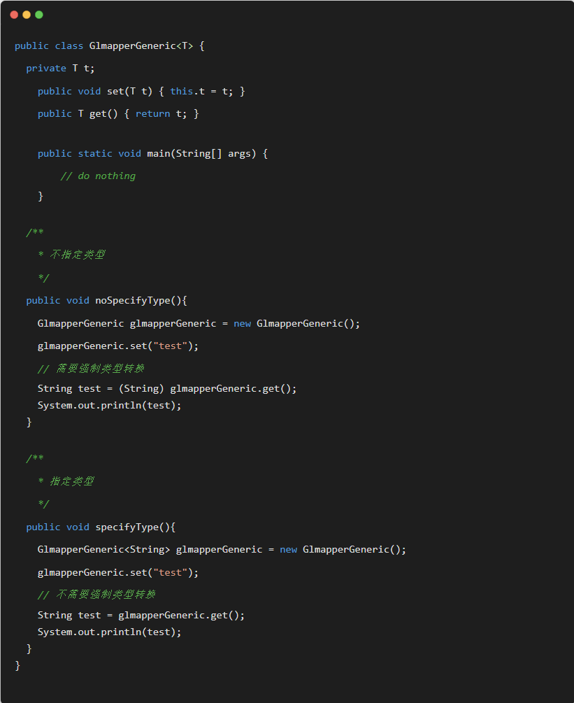 上面这段代码中的 specifyType 方法中 省去了强制转换,可以在编译时候检查类型安全,可以用在类,方法,接口上。