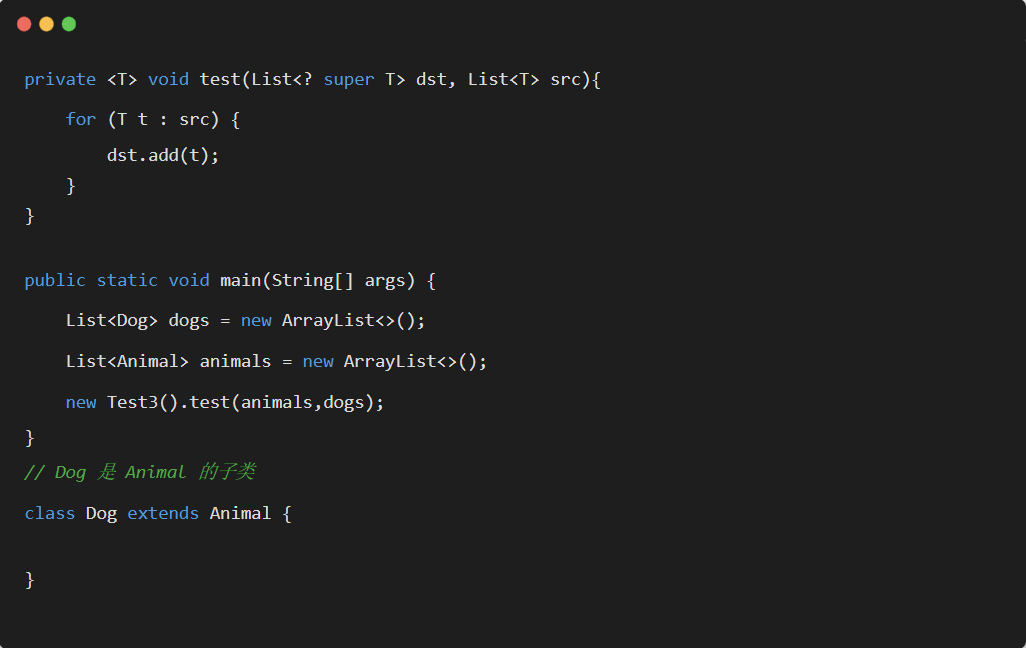 在类型参数中使用 super 表示这个泛型中的参数必须是 E 或者 E 的父类。
