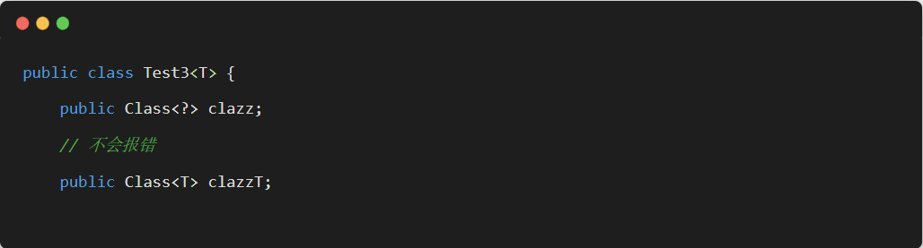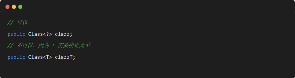 Class在实例化的时候,T 要替换成具体类。Class<?>它是个通配泛型,? 可以代表任何类型,所以主要用于声明时的限制情况。比如,我们可以这样做申明: