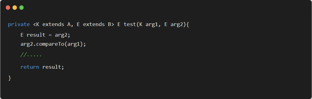使用 & 符号设定多重边界(Multi Bounds),指定泛型类型 T 必须是 MultiLimitInterfaceA 和 MultiLimitInterfaceB 的共有子类型,此时变量 t 就具有了所有限定的方法和属性。对于通配符来说,因为它不是一个确定的类型,所以不能进行多重限定。