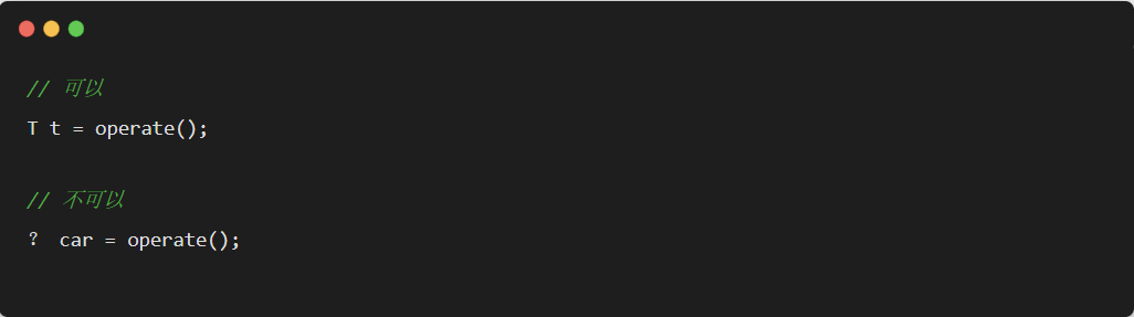 ?和 T 都表示不确定的类型,区别在于我们可以对 T 进行操作,但是对 ? 不行,比如如下这种 :