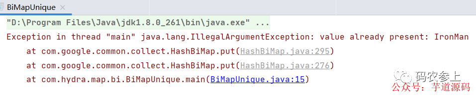 ```plain text HashBiMap<String, String> biMap = HashBiMap.create(); biMap.put(“Tony”,”IronMan”); biMap.put(“Stark”,”IronMan”);