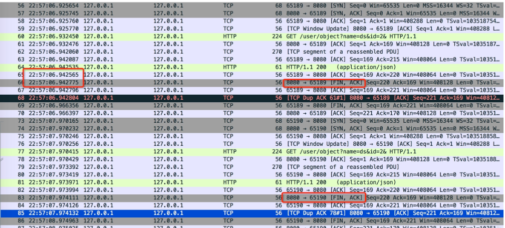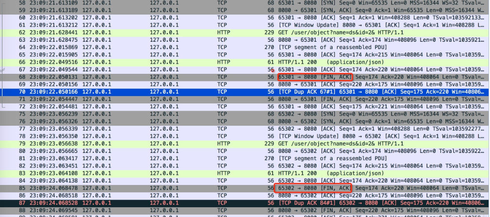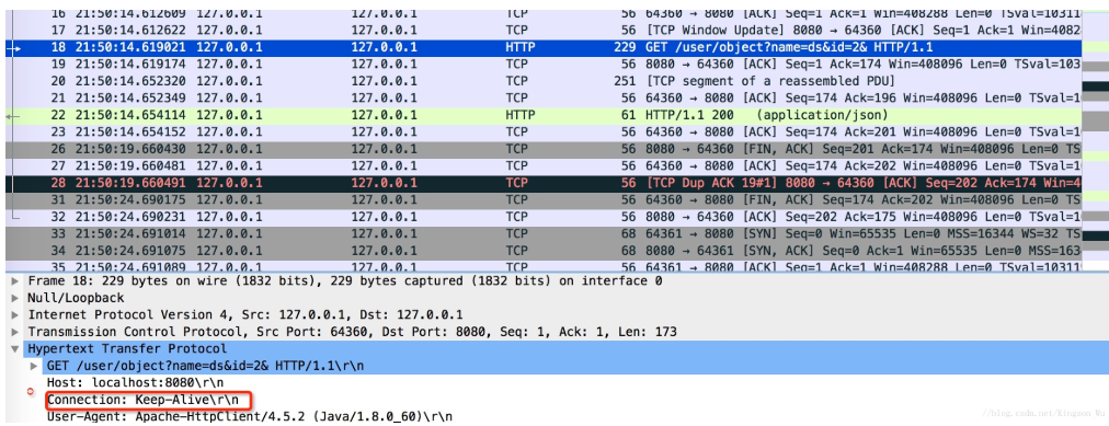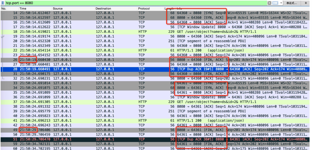 ```plain text 从图中可以看到:第一次请求的端口是64360,并且在5秒之后,由服务端主动发送fin包关闭连接。而第二次请求显然已经不能复用连接了,使用的新的端口64361重新连接服务器,后续的行为基本和第一次请求一样。