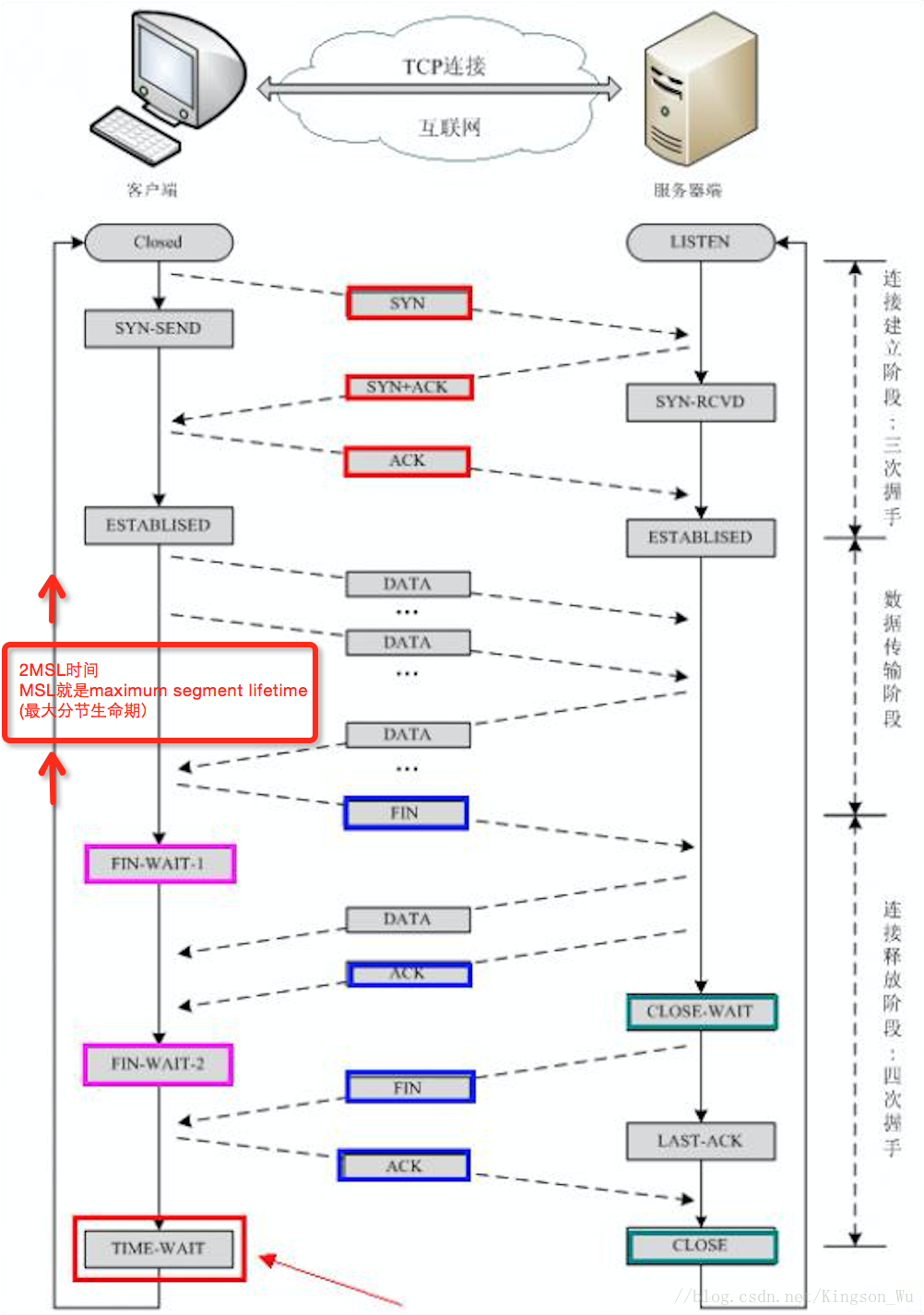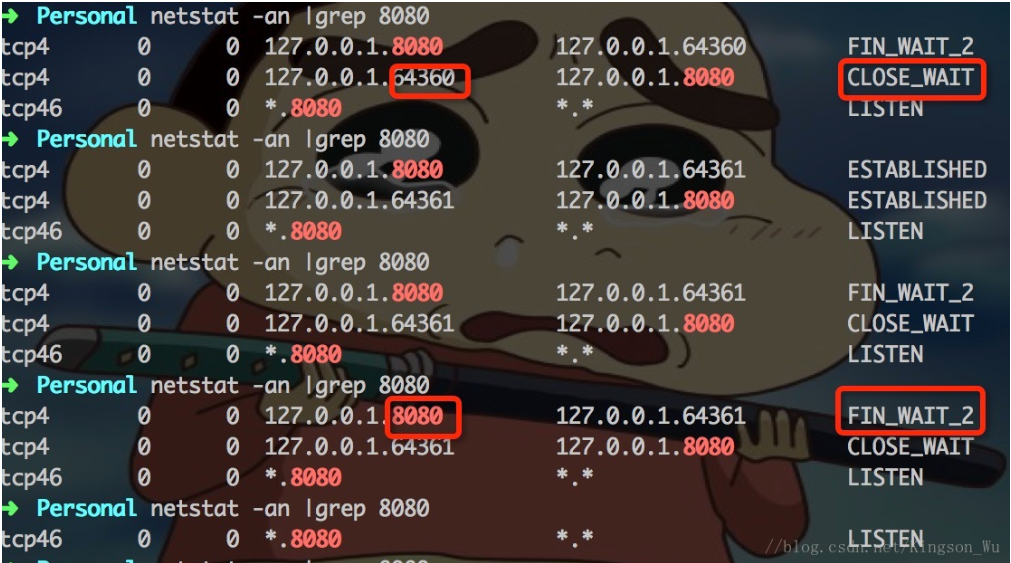 plain text 可以看到服务端8080端口进入了FIN_WAIT_2状态,参照文中刚开始的第一张图,这显然是主动关闭方才会有的状态,同样64360进入了CLOSE_WAIT状态,说明client端是被动关闭的。