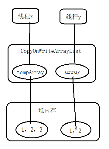 由于整个过程未加锁,可能导致一个线程x在获取array后,另一个线程y进行了remove操作,假设要删除的元素为3。remove操作首先会获取独占锁,然后进行写时复制操作,也就是复制一份当前array数组,然后再复制的数组里面删除线程x通过get方法要访问的元素3,之后让array指向复制的数组。而这时线程x仍持有对原来的array的引用,导致虽然线程y删除了元素3,线程x仍能获得3这个元素,如图: