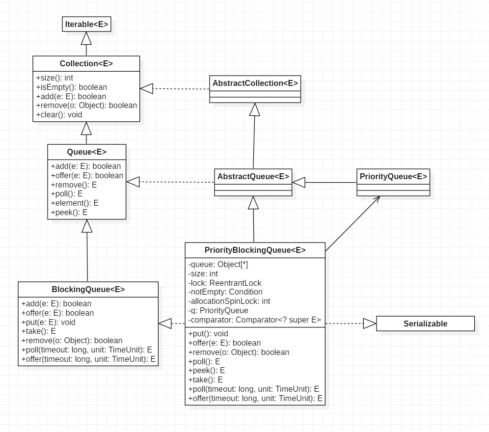 PriorityBlockingQueue内部有一个数组queue,用来存放队列元素。allocationSpinLock是个自旋锁,通过CAS操作来保证同时只有一个线程可以扩容队列,状态为0或1。