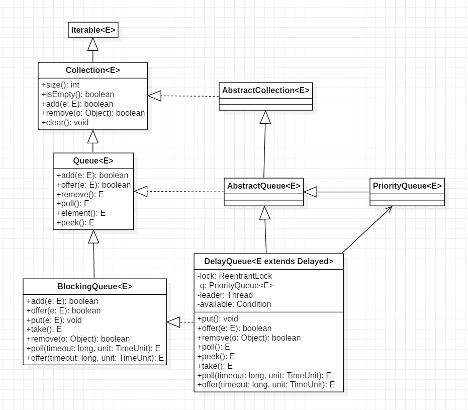 DelayQueue内部使用PriorityQueue存放数据,使用ReentrantLock实现线程同步。 队列里的元素要实现Delayed接口(Delayed接口继承了Comparable接口),用以得到过期时间并进行过期时间的比较。