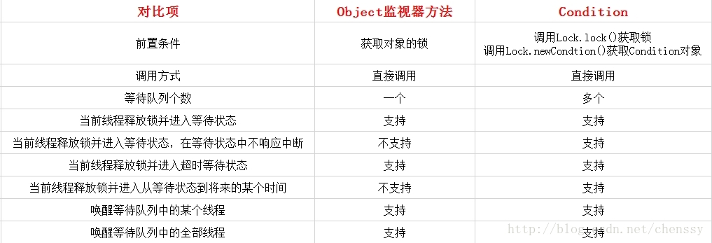 在没有 Lock 之前,我们使用 synchronized 来控制同步,配合 Object 的 #wait()、#notify() 等一系列方法可以实现等待 / 通知模式。在 Java SE 5 后,Java 提供了 Lock 接口,相对于 synchronized 而言,Lock 提供了条件 Condition ,对线程的等待、唤醒操作更加详细和灵活。下图是 Condition 与 Object 的监视器方法的对比(摘自《Java并发编程的艺术》):