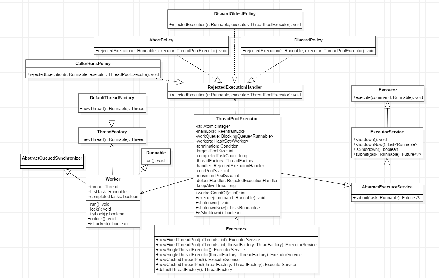 如图所示,Executors是个工具类,用来提供不同特性的线程池。ThreadPoolExecutor中的ctl是一个原子变量,用来记录线程池状态和线程池中的线程个数,类似于ReentrantReadWriteLock中使用一个变量来保存两种信息。