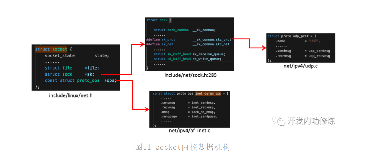 socket数据结构中的const struct proto_ops对应的是协议的方法集合。每个协议都会实现不同的方法集,对于IPv4 Internet协议族来说,每种协议都有对应的处理方法,如下。对于udp来说,是通过inet_dgram_ops来定义的,其中注册了inet_recvmsg方法。