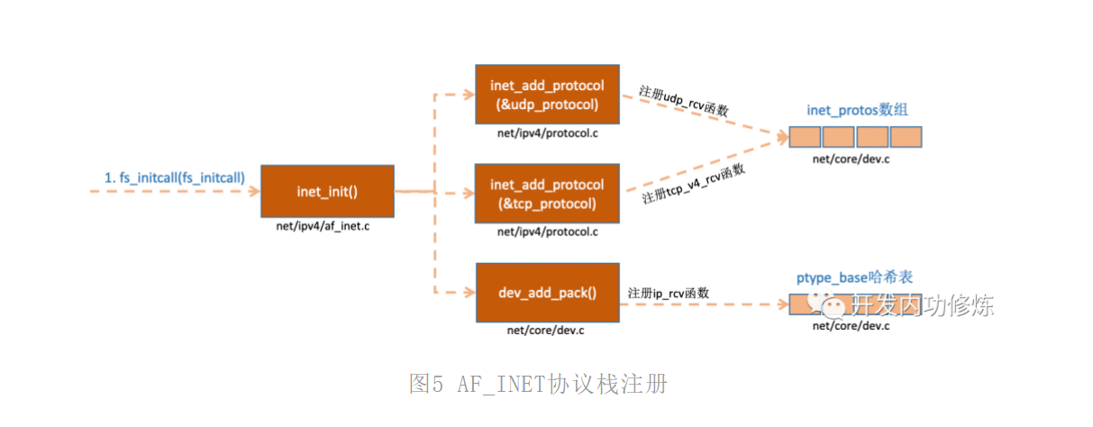 inet_add_protocol函数将tcp和udp对应的处理函数都注册到了inet_protos数组中了。再看dev_add_pack(&ip_packet_type);这一行,ip_packet_type结构体中的type是协议名,func是ip_rcv函数,在dev_add_pack中会被注册到ptype_base哈希表中。