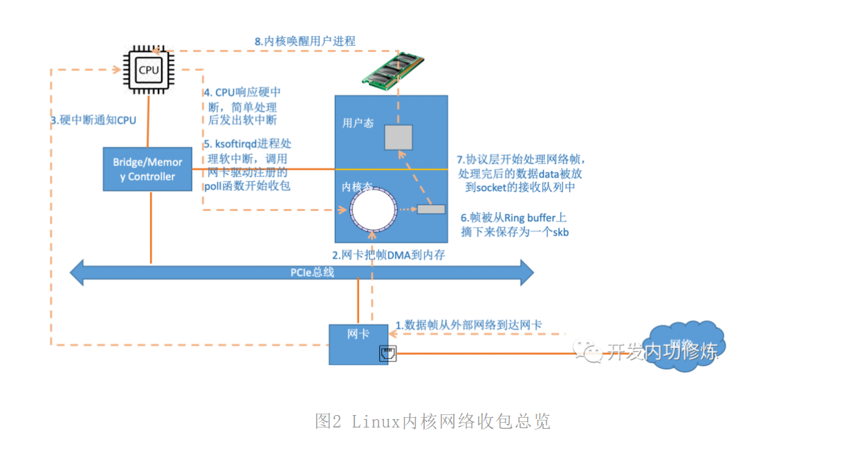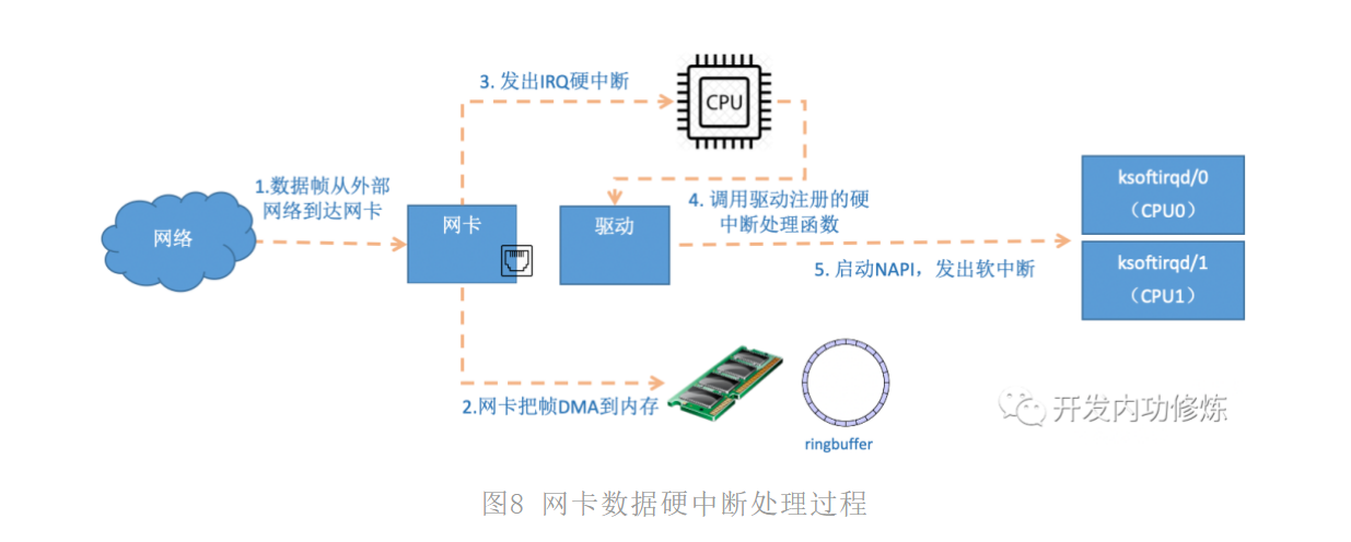 - 网卡将数据帧DMA到内存的RingBuffer中,然后向CPU发起中断通知