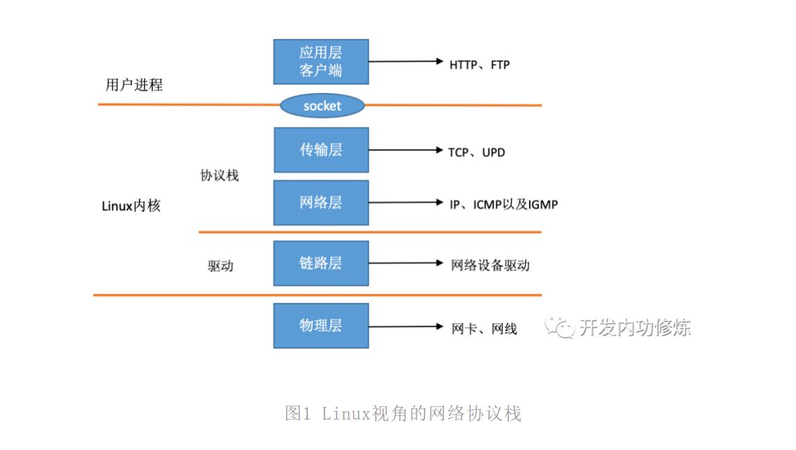 在Linux内核实现中,链路层协议靠网卡驱动来实现,内核协议栈来实现网络层和传输层。内核对更上层的应用层提供socket接口来供用户进程访问。我们用Linux的视角来看到的TCP/IP网络分层模型应该是下面这个样子的。