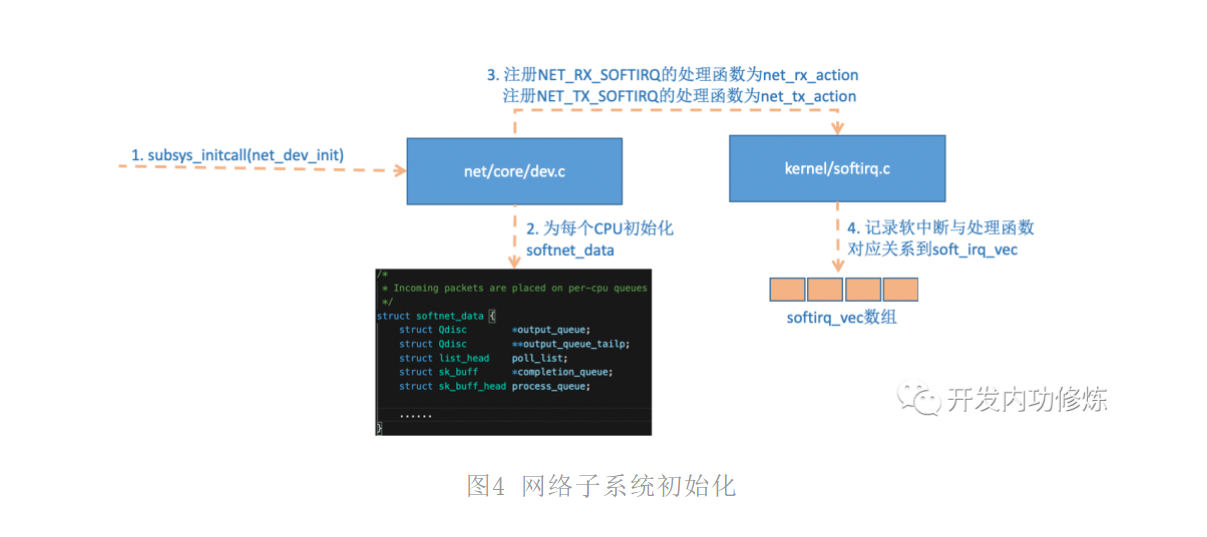 linux内核通过调用subsys_initcall来初始化各个子系统,在源代码目录里你可以grep出许多对这个函数的调用。这里我们要说的是网络子系统的初始化,会执行到net_dev_init函数。