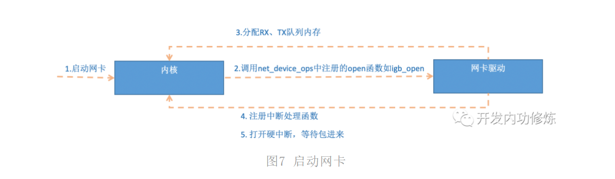 - 启动网卡,分配RX,TX队列,注册中断对应的处理函数