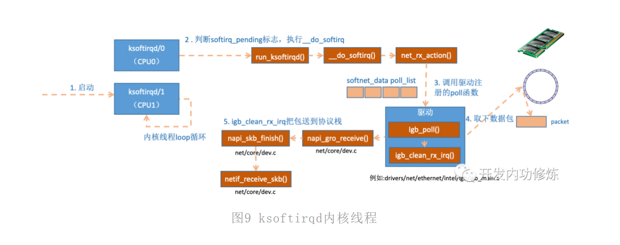 - ksoftirqd线程开始调用驱动的poll函数收包