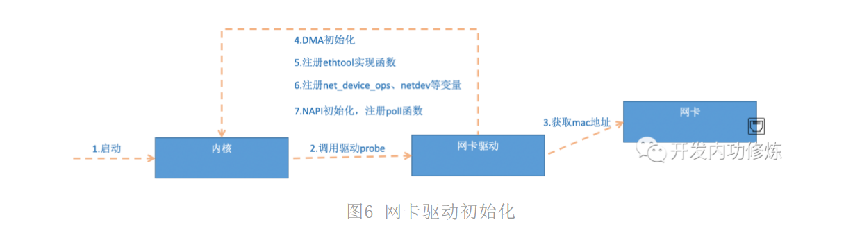 - 网卡驱动初始化,每个驱动都有一个初始化函数,内核会让驱动也初始化一下。在这个初始化过程中,把自己的DMA准备好,把NAPI的poll函数地址告诉内核
