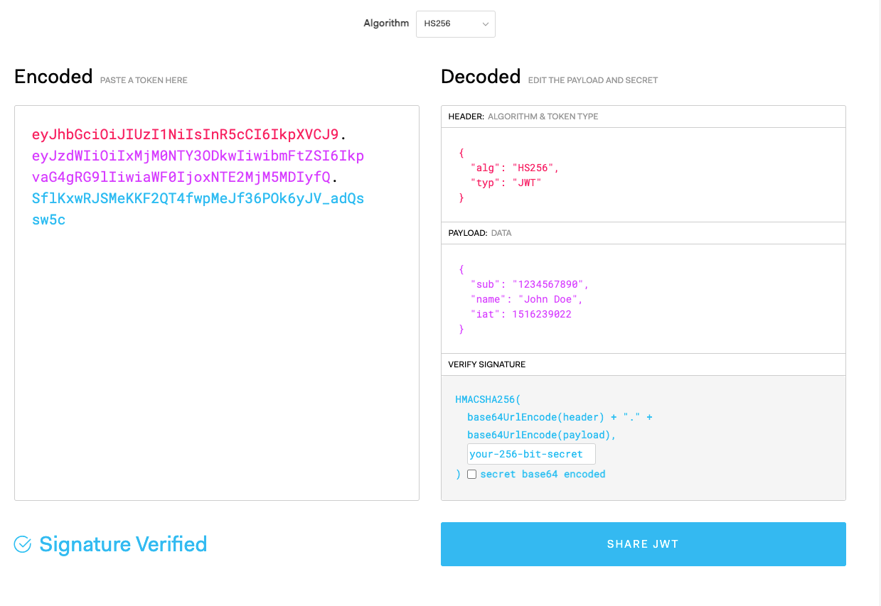 ```plain text eyJhbGciOiJIUzI1NiIsInR5cCI6IkpXVCJ9. eyJzdWIiOiIxMjM0NTY3ODkwIiwibmFtZSI6IkpvaG4gRG9lIiwiaWF0IjoxNTE2MjM5MDIyfQ. SflKxwRJSMeKKF2QT4fwpMeJf36POk6yJV_adQssw5c