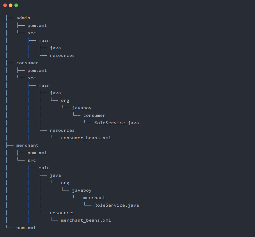 现在 consumer 和 merchant 中都有一个 RoleService 类,然后在各自的配置文件中,都将该类注册到 Spring 容器中。org.javaboy.consumer.RoleService: