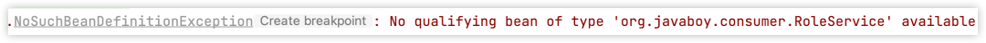 小伙伴们看到,这个是找不到 org.javaboy.consumer.RoleService 服务,但是另外一个 RoleService 其实是找到了,因为默认情况下后面定义的同名 Bean 把前面的覆盖了,所以有一个 Bean 就找不到了。