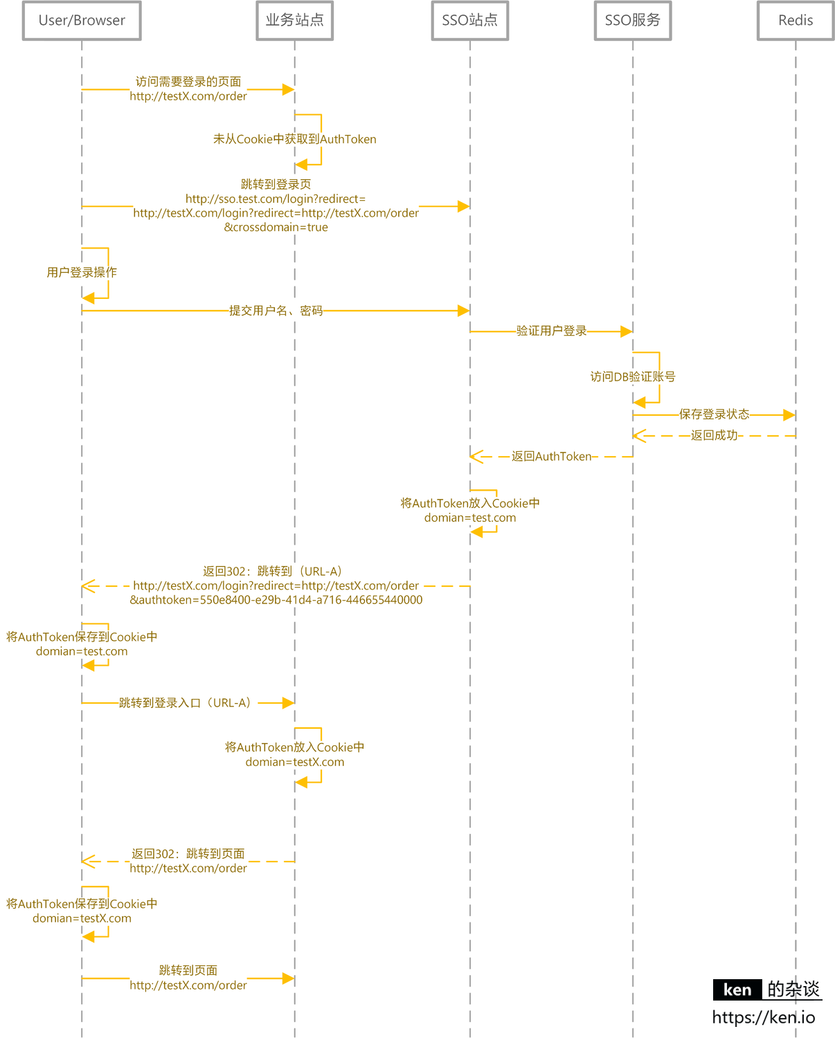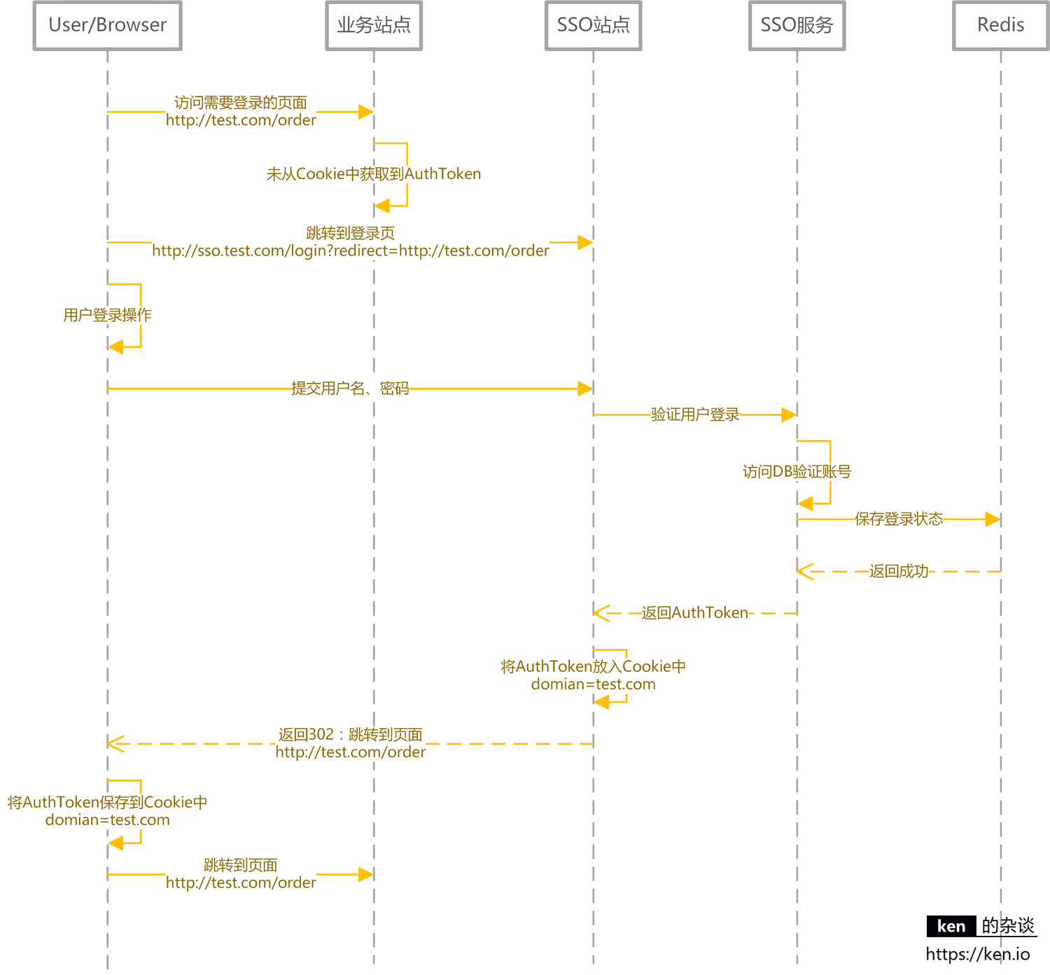 常见的Web框架对于Sessionopen in new window的实现都是生成一个SessionId存储在浏览器Cookie中。然后将Session内容存储在服务器端内存中,这个 ken.io 在之前Session工作原理open in new window中也提到过。整体也是借鉴这个思路。 用户登录成功之后,生成AuthToken交给客户端保存。如果是浏览器,就保存在Cookie中。如果是手机App就保存在App本地缓存中。本篇主要探讨基于Web站点的SSO。 用户在浏览需要登录的页面时,客户端将AuthToken提交给SSO服务校验登录状态/获取用户登录信息