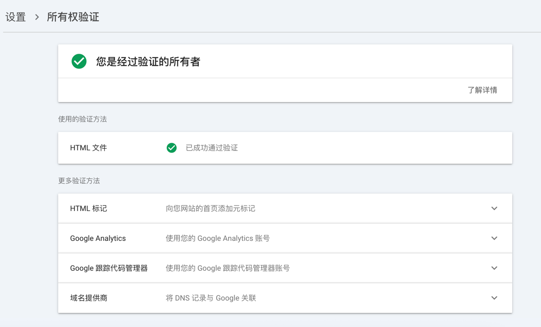 网站给我们提示了一个推荐验证方法:是通过在你的网站上添加一个它提供的HTML文件来验证,我们将这个 html 文件下载下来,并上传到 GitHub,通过浏览器能正常访问该文件就可以。点击“验证”提示已完成所有权验证